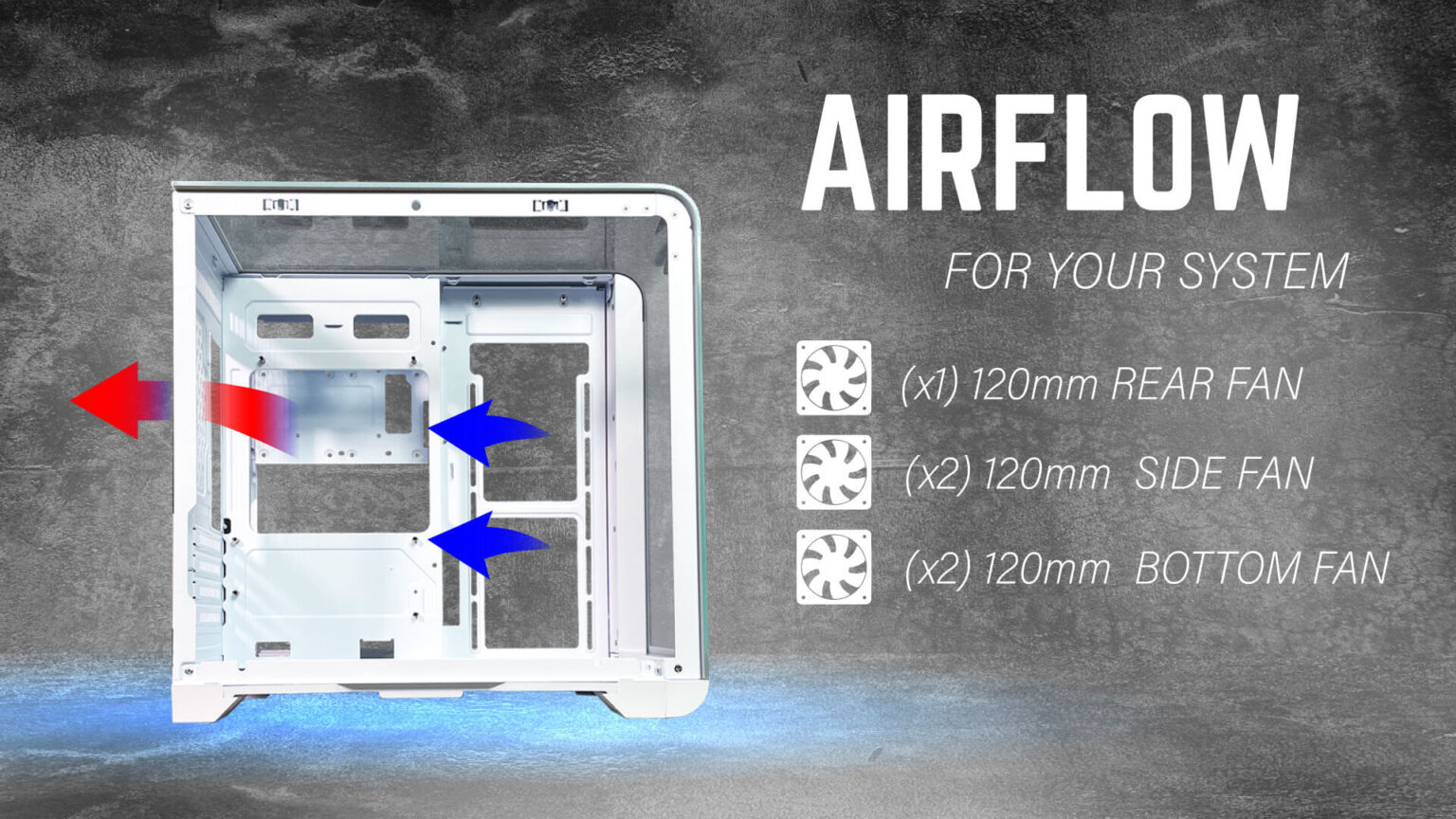 • Fan Support = (REAR) 1X 120MM ; (SIDE) 2X120MM ; (BOTTOM) 2X 120MM