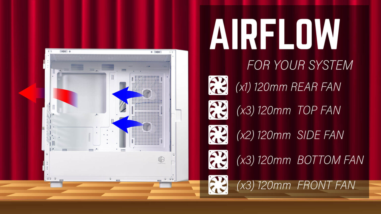 - Fan support = (TOP) 3X 120MM ; (REAR) 1X 120MM ; (SIDE) 2X120MM ; (BOTTOM) 3X 120MM ; (FRONT) 3X120MM
