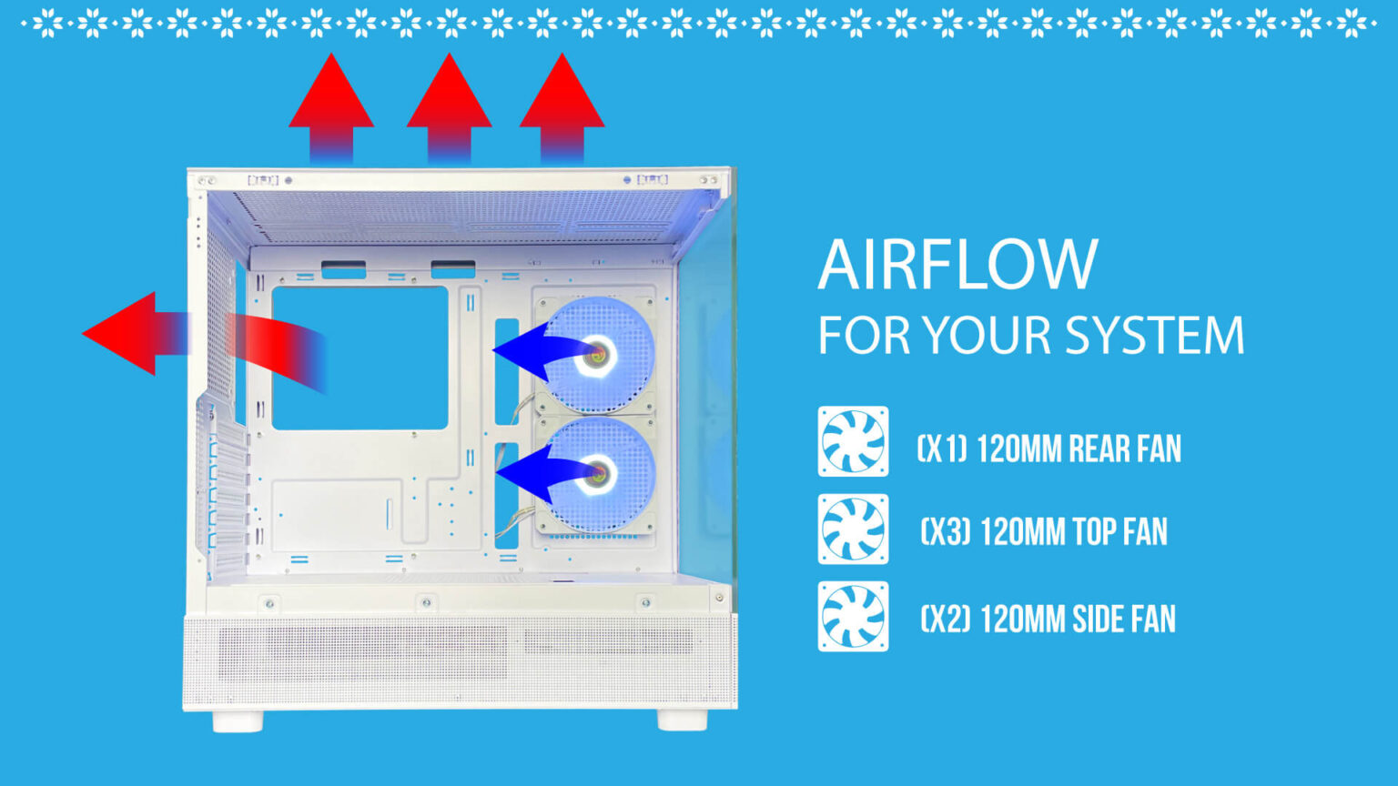 - Fan Support : (Top) 3X 120MM ; (Side) 2X 120MM ; (Rear) 1X 120MM