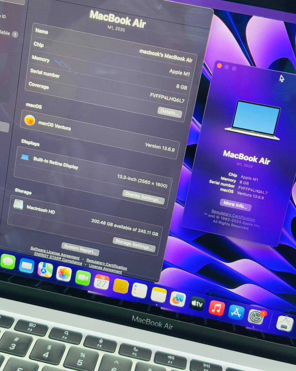 Macbook Air 2020 Chip M1 Ram 8 Gb Ssd 256 Gb Layar 13.3 inc Resolusi 2K Condition Batry Normal 97%