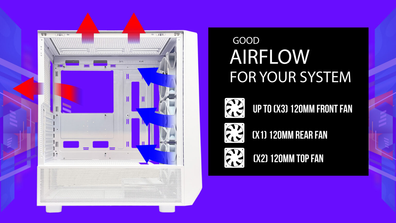 • Fan Support : (FRONT) 3X 120MM ; (REAR) 1X 120MM ; (TOP) 2X 120MM