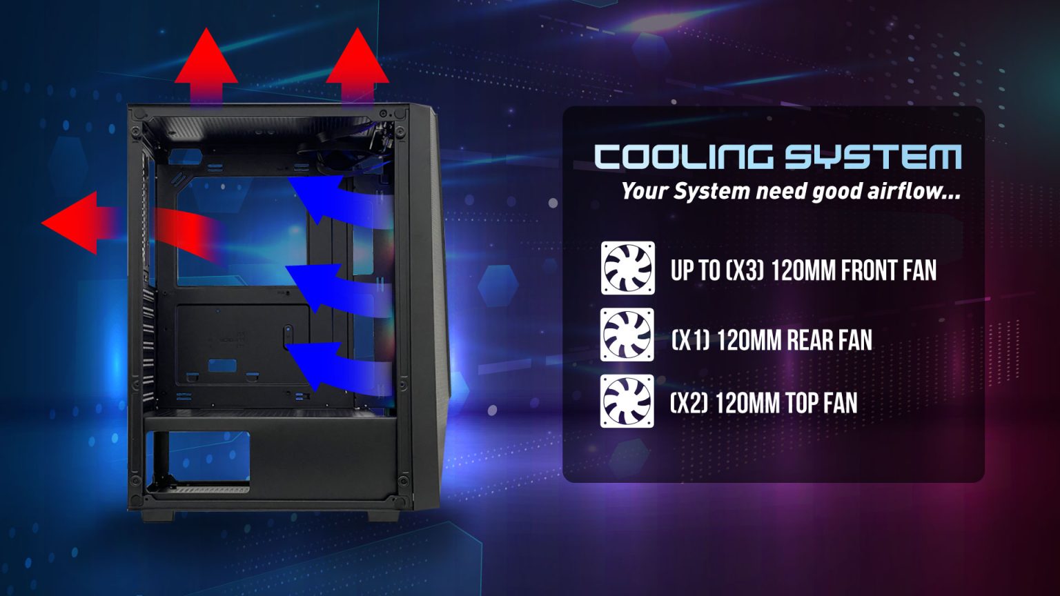 - Fan Support: (REAR) 1X 120MM ; (TOP) 2X 120MM ; (FRONT) 3X 120MM