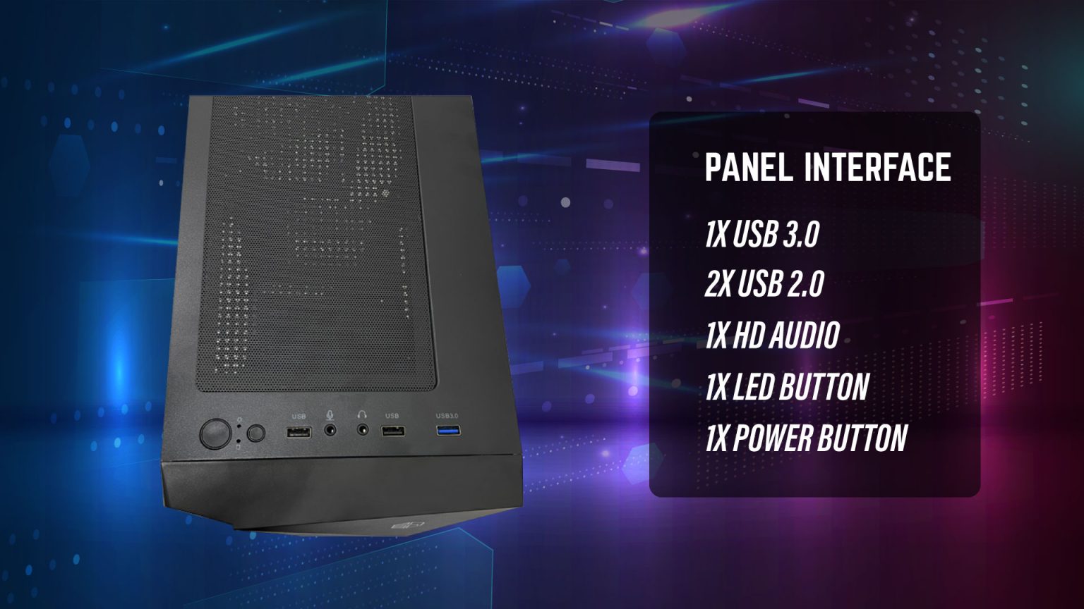 - I/O Ports: 1X POWER, 2X USB 2.0, 1X USB 3.0, 1X LED BUTTON, HD AUDIO 3.5MM